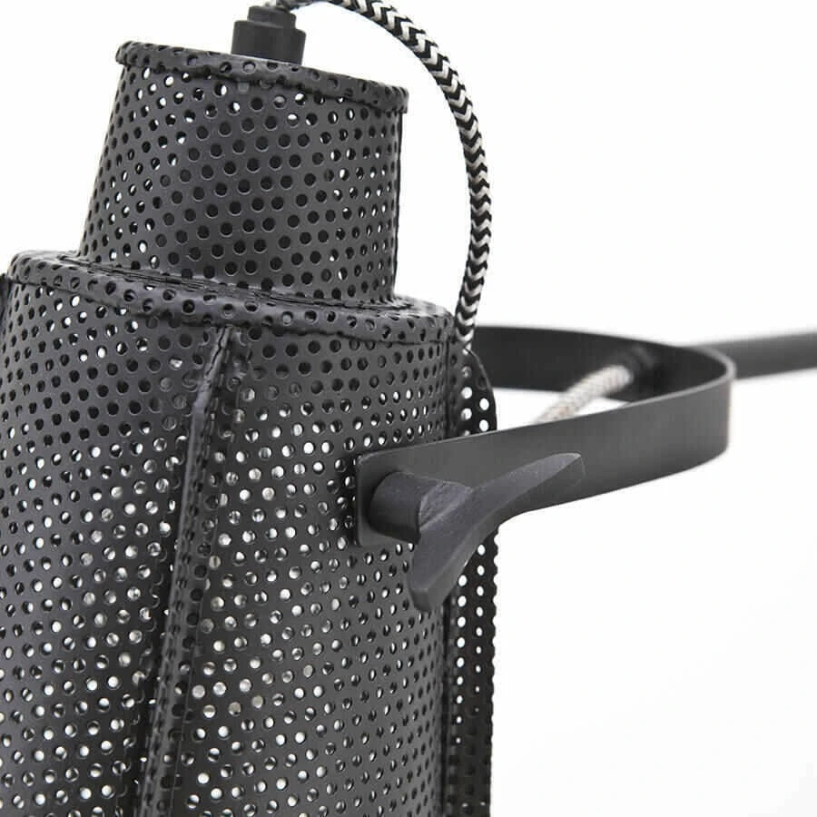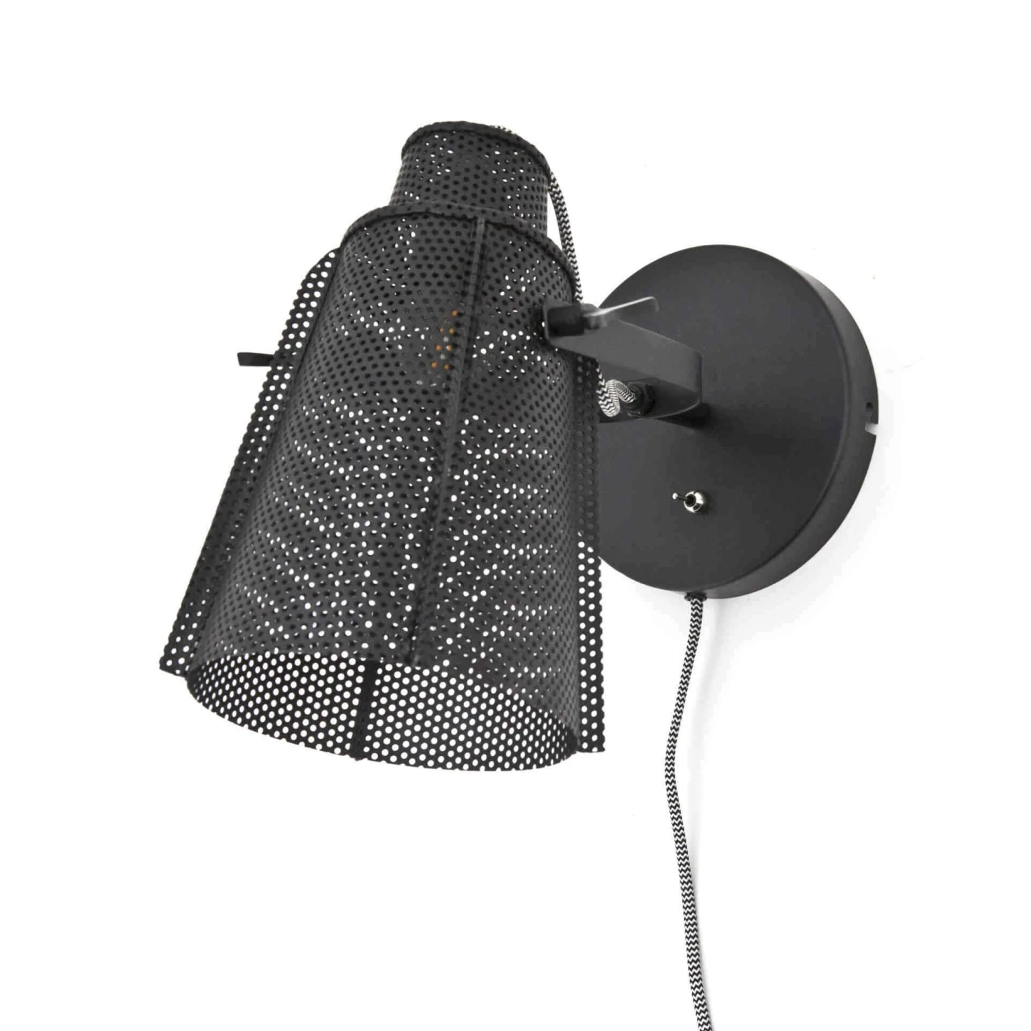 Kevytlinjainen musta seinävalaisin. Kuvussa paljon pieniä reikiä, joista valo säteilee kauniisti myös valaisimen ympäristöön, kuitenkaan häikäisemättä silmiä.