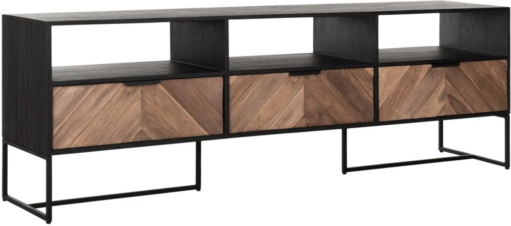 Jotain erilaista – tyylillä. Upean näyttävä kalanruotokuvioinen Criss Cross tv-taso kierrätystiikistä. Laadukas, ja niin katsetta kuin käyttöäkin kestävä säilytyskaluste, jossa on sekä avointa tilaa että kolme kätevää vetolaatikkoa. Täydellinen ja ikuinen kaluste täyspuusta laatua arvostavalle sisustajalle!