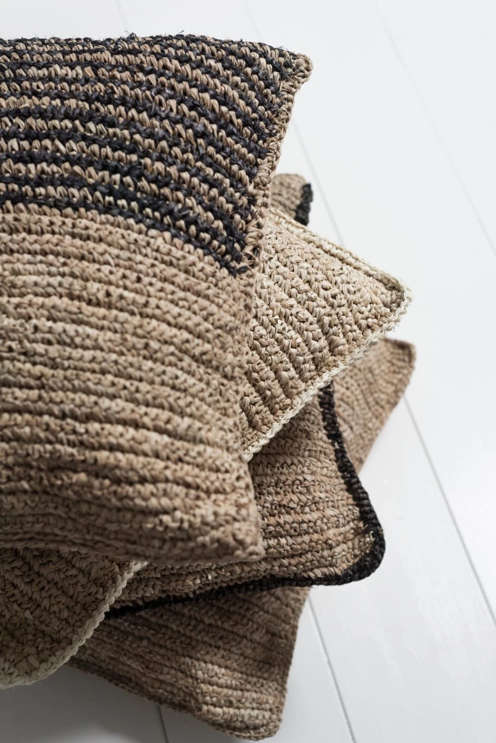 Näyttävän muhkea luonnonläheinen boho sisustustyyny. Laadukas palmunlehti on punottu kauniiksi tyynynpäälliseksi ja värjätty osittain mustaksi. Luonnonmateriaali tuo mukavasti maanläheistä lämpöä sisustukseen, niin sisätiloihin kuin vaikka terassillekin. Tutun juuttityynyn luksusversiosta ei jää hituleita soffalle eikä Aino-tädin mustaan kolttuun myöskään. Upea materiaali kerrassaan! Tällä tuotteella tuot vähän tyylikästä luksusta sohvatyynyjen joukkoon harmonisella tavalla. Sisätyyny sisältyy.