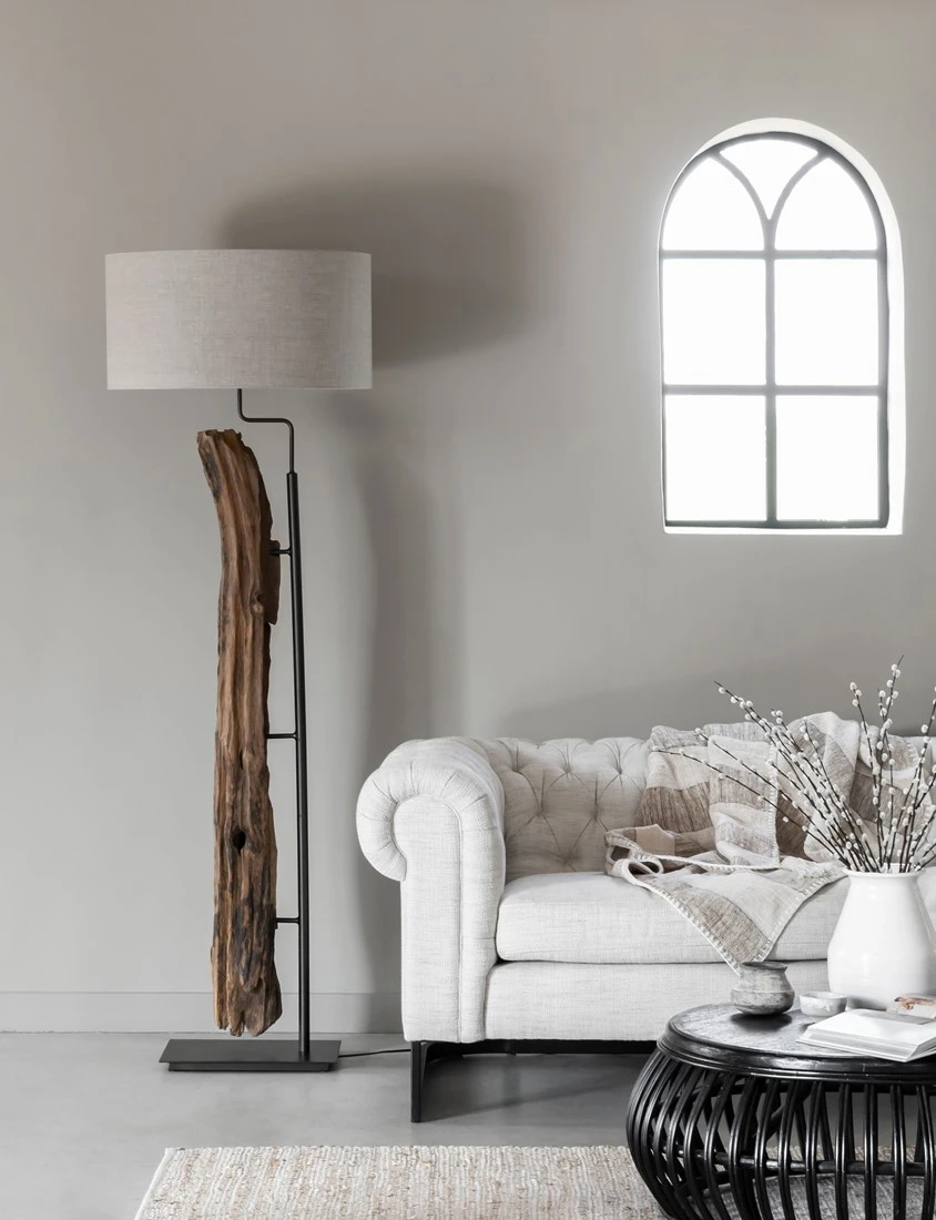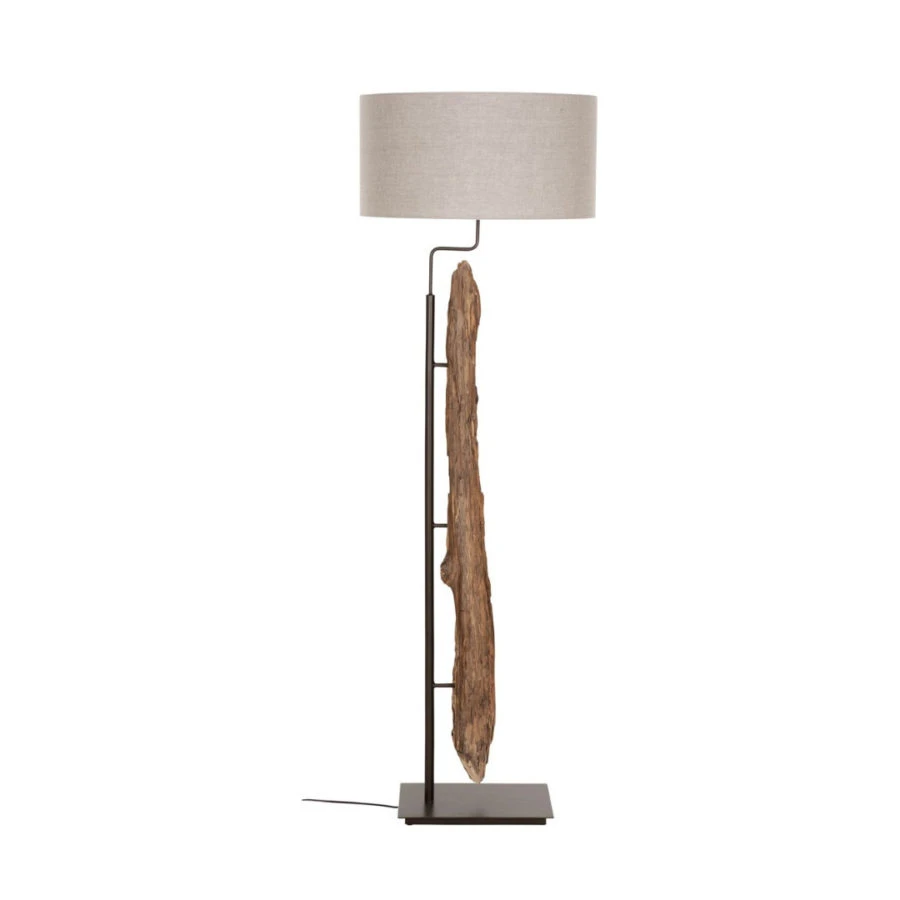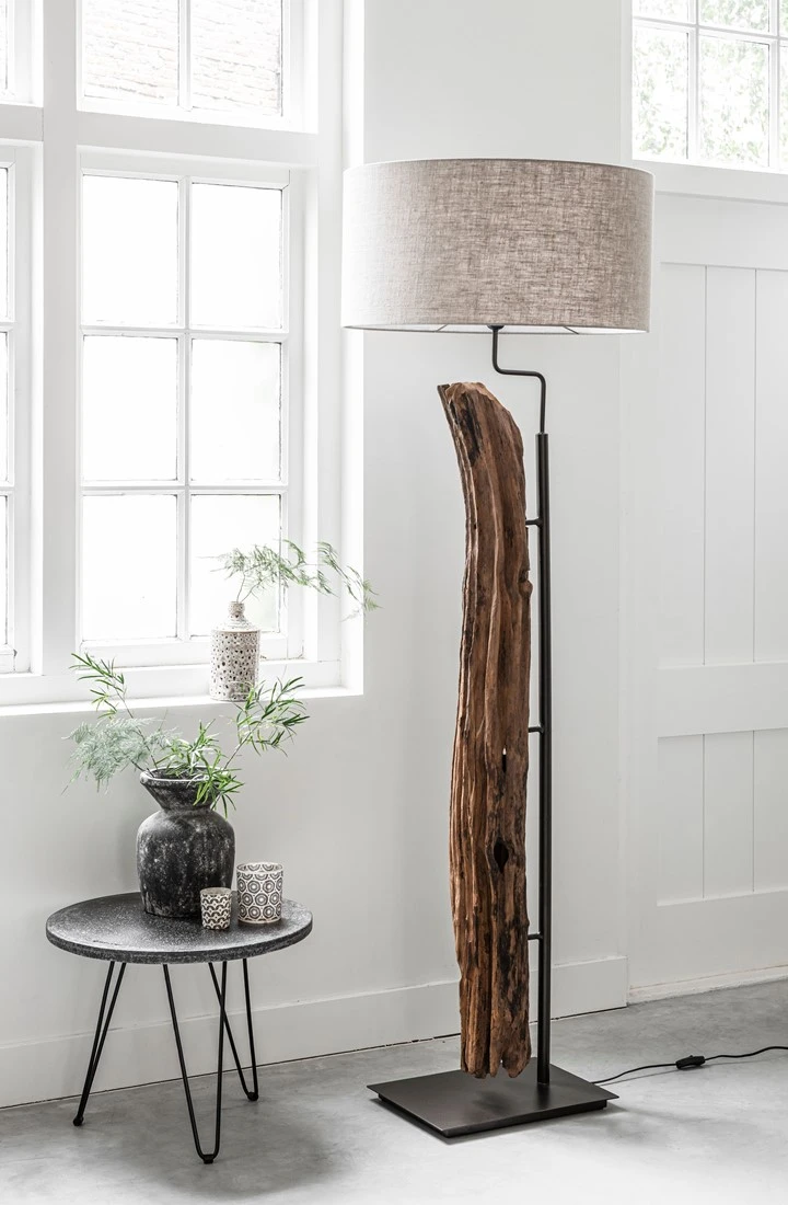 Contemporary rustiikki jalkavalaisin on näyttävä suuri valaisin paikkaan, jossa kaivataan extra säväytystä. Upea kierrätystiikkinen ajopuujalka on aina uniikki ja 60cm canvaskupu viimeistelee sekä näyttävän tyylin että upean laajalle leviävän tunnelmavalon.