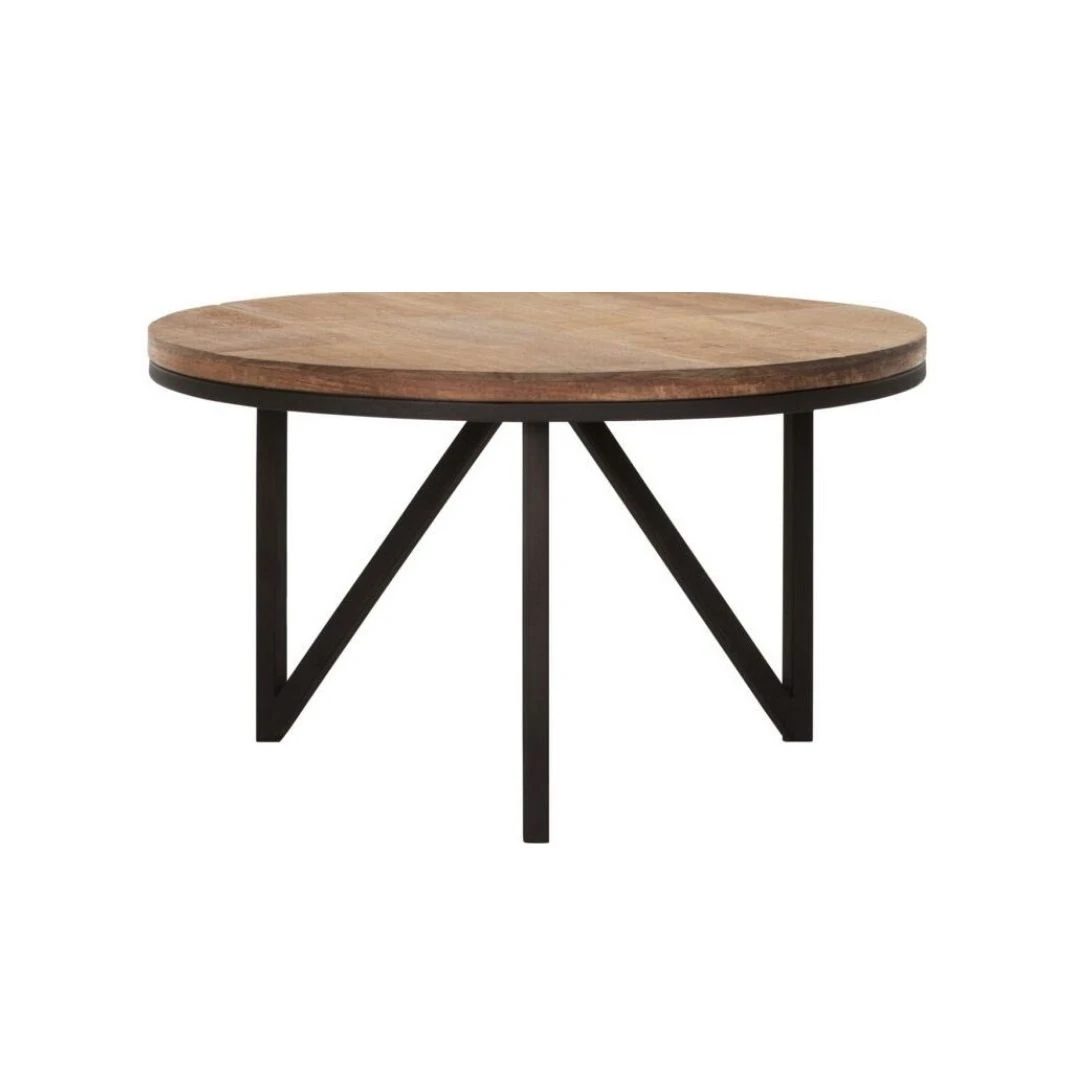 Tyylikäs pyöreä puinen sohvapöytä vahvoilla mustilla metallijaloilla. Tyylikkään viimeistelemättömäksi jätetty rouhea tiikkipinta tuo kotoisuutta ja lämpöä sisustukseen. Rautakehys nousee kauniisti tiikkipuisen pöytälevyn alle ja luo pöydälle kehyksen. Jalat muodostavat näyttävän kolmiokuvion. Tälle tiikkipöydälle voit huoletta laskea kahvikupin tai viinilasin. Se ei pienestä hetkahda ja on myös helppohoitoinen.