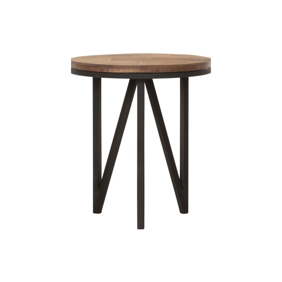 Tyylikäs puinen pyöreä sohvapöytä vahvoilla mustilla metallijaloilla. Tyylikkään viimeistelemättömäksi jätetty rouhea tiikkipinta tuo kotoisuutta ja lämpöä sisustukseen. Rautakehys nousee kauniisti tiikkipuisen pöytälevyn alle ja luo pöydälle kehyksen. Jalat muodostavat näyttävän kolmiokuvion. Tälle tiikkipöydälle voit huoletta laskea kahvikupin tai viinilasin. Se ei pienestä hetkahda ja on myös helppohoitoinen.