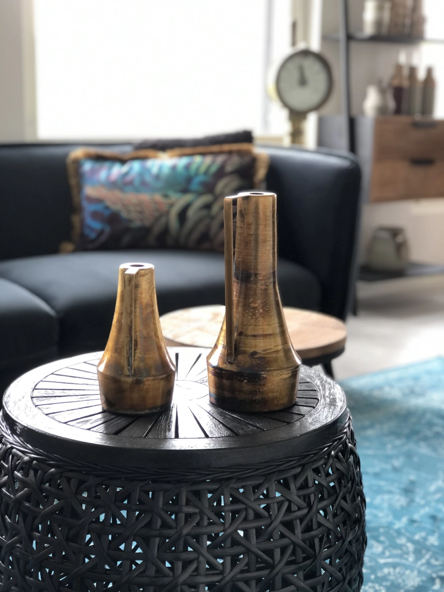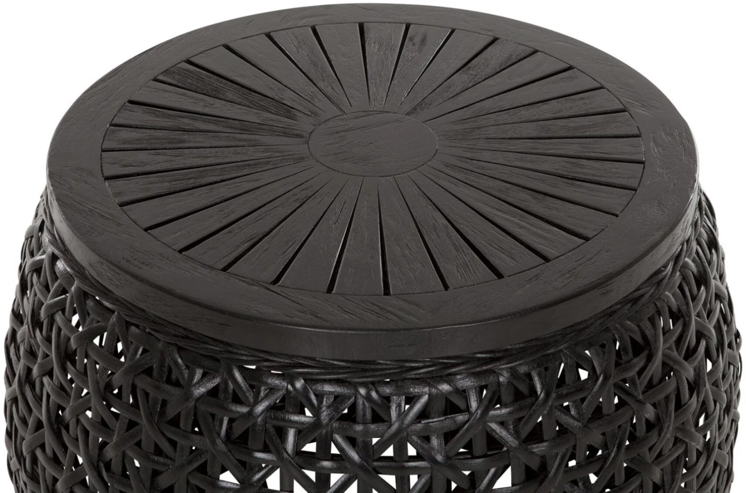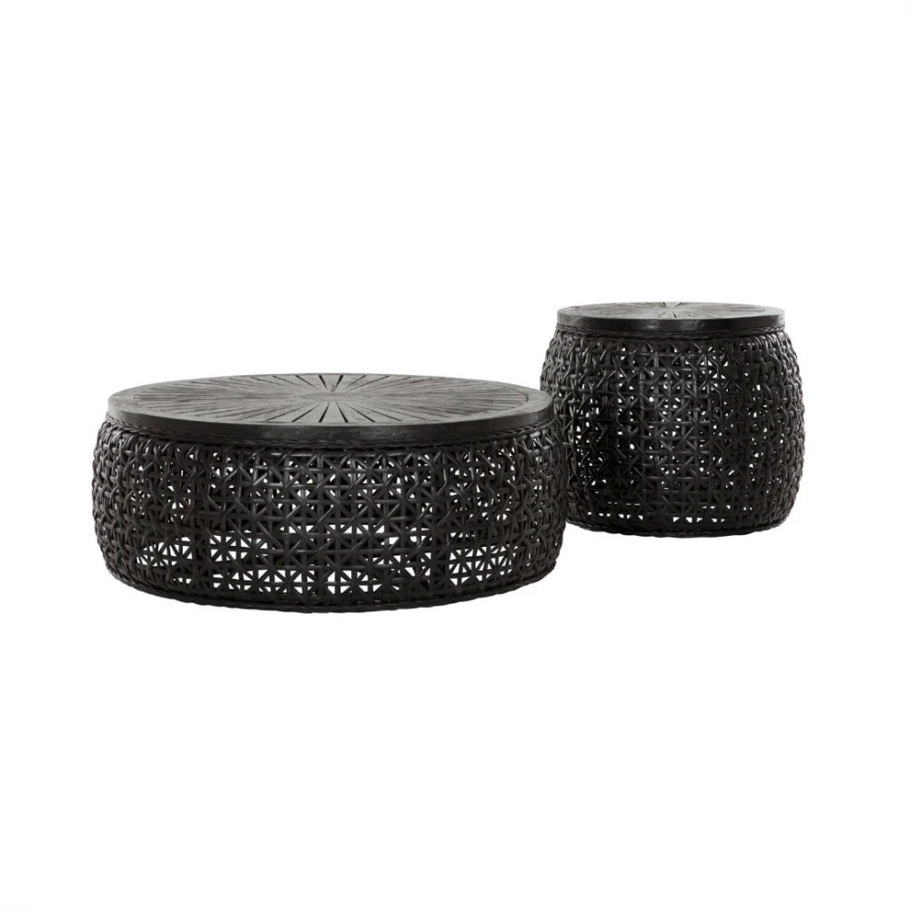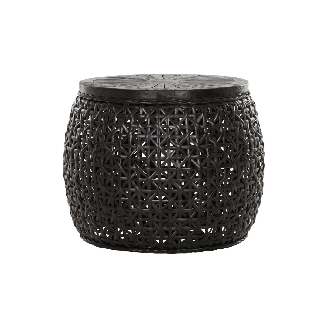 Musta pyöreä rottinkipöytä tyylikkään boheemiin sisustumakuun. Rottinkinen pyöreä pöytä vahvasta punoksesta tukevalla puupöytälevyllä. Kaksi kokoa.