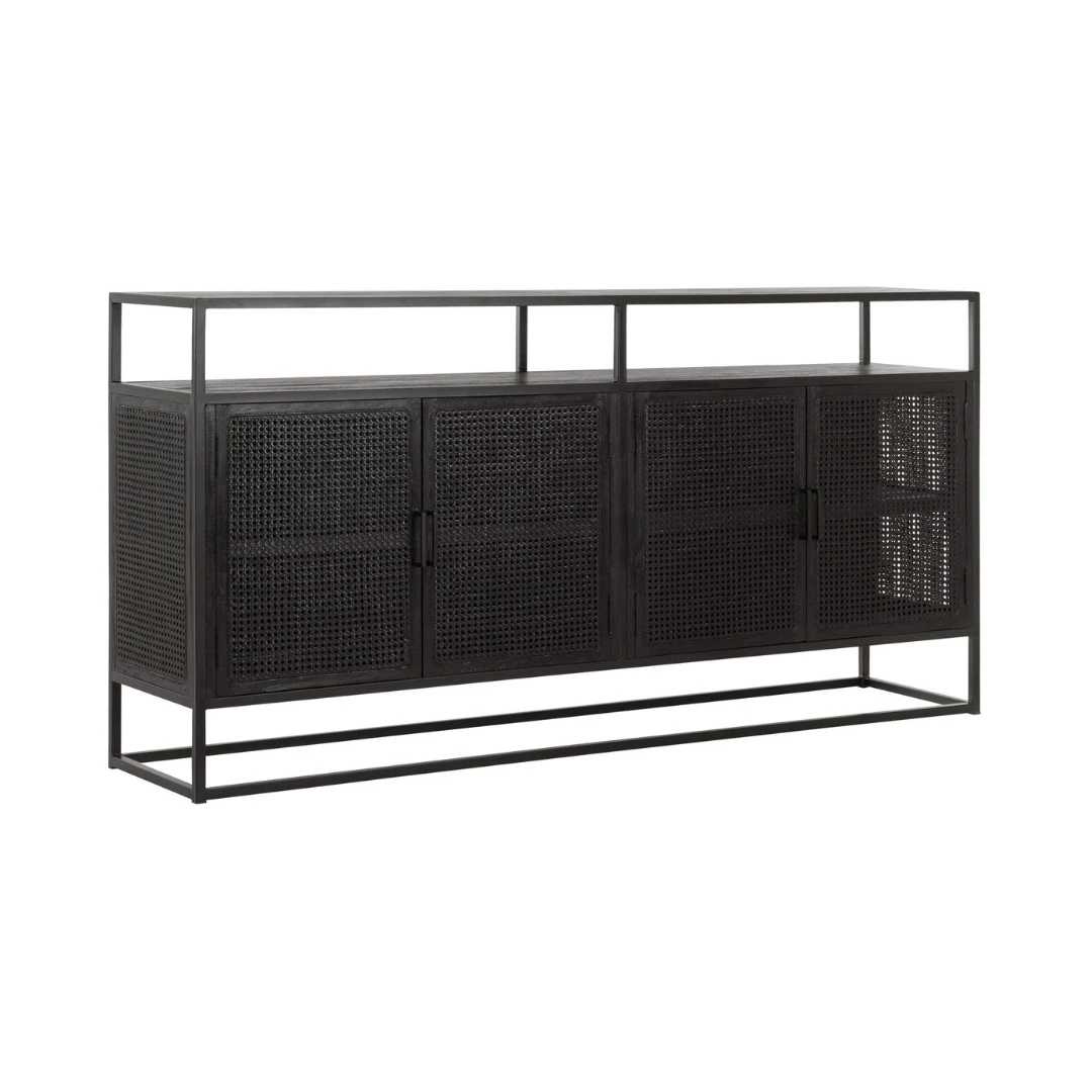 Upean näyttävä musta rottinkisenkki on ripauksen loft-henkinen kaappi kuitenkin lämpimällä tavalla kodikas. Laadukas rottinkipunos kestää niin katsetta kuin käyttöäkin ja sisäosien täyspuuhyllyille voit pinota niin astiat kuin muutakin painavaa halutessasi. Täydellinen kaappi, jos toivot kauniit käyttöesineesi suojaan pölyltä, mutta kuitenkin hieman näkösälle. Yksi avoin hyllytaso yläpinnan alla keventää tyylikkästi ison kalusteen tyyliä. Käytännöllinen ja kestävä säilytyskaluste eteiseen, ruokailutilaan tai olohuoneeseen. Jotain erilaista tyylillä!