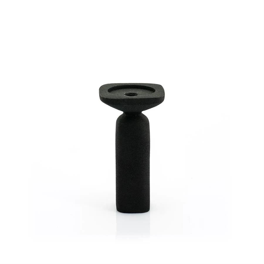 Pehmeitä linjoja yllätyksellisillä materiaaliyhdistelmillä. Tämä kaunis pyöreälinjainen musta kynttilänjalka vaikuttaa kiveltä, mutta on tehty metallista ja hiekkakäsitelty päältä. Käsitettelyllä on saatu aikaan upea mielenkiintoinen musta mattapinta tähän pöytäkynttilälle tai isolle tuikulle sopivaan kynttilänjalkaan. Yhdistä saman sarjan muihin kokoihin.