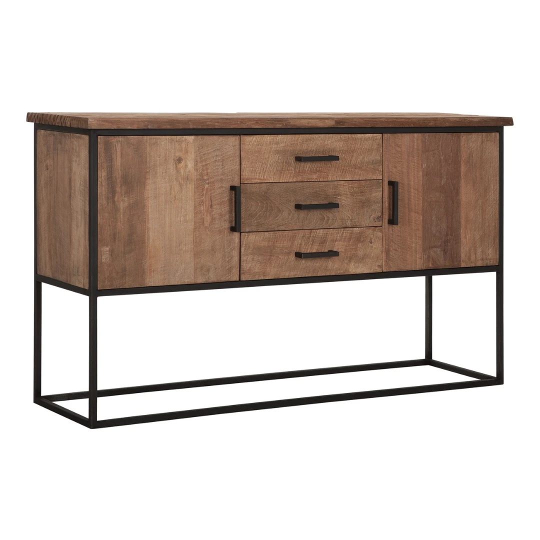Tyylikäs puinen senkki mattamustalla metallirungolla. Rouhea, mutta taidokkaasti viimeistelty tiikkipinta tuo kotoisuutta ja lämpöä sisustukseen. Kaksi ovellista kaappia sekä kolme laatikkoa. Tukeva senkki seisoo jaloillaan, mikä tuo ilmavuutta isoon astiakaappiin. Monikäyttöinen, helppohoitoinen ja näyttävä tiikkipuinen senkki.