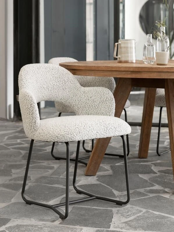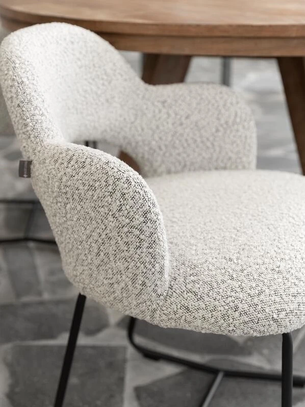 Käsinojallinen Vista ruokapöydän tuoli kutsuu istumaan pidempääkin iltaa. Tuolissa on metallinen tukeva runko ja jalat sekä miellyttäväksi pehmustettu bouclekankainen istuinosa. Pienet käsinojat tuovat extramukavuutta. Harmaa tuoli on helppohoitoinen värivalinta. Istuimen jämäkkä mutta pehmeä selkänoja on muotoiltu hieman kuppimaiseksi, mikä tekee tuolista istuinmukavuudeltaan huippuhyvän.